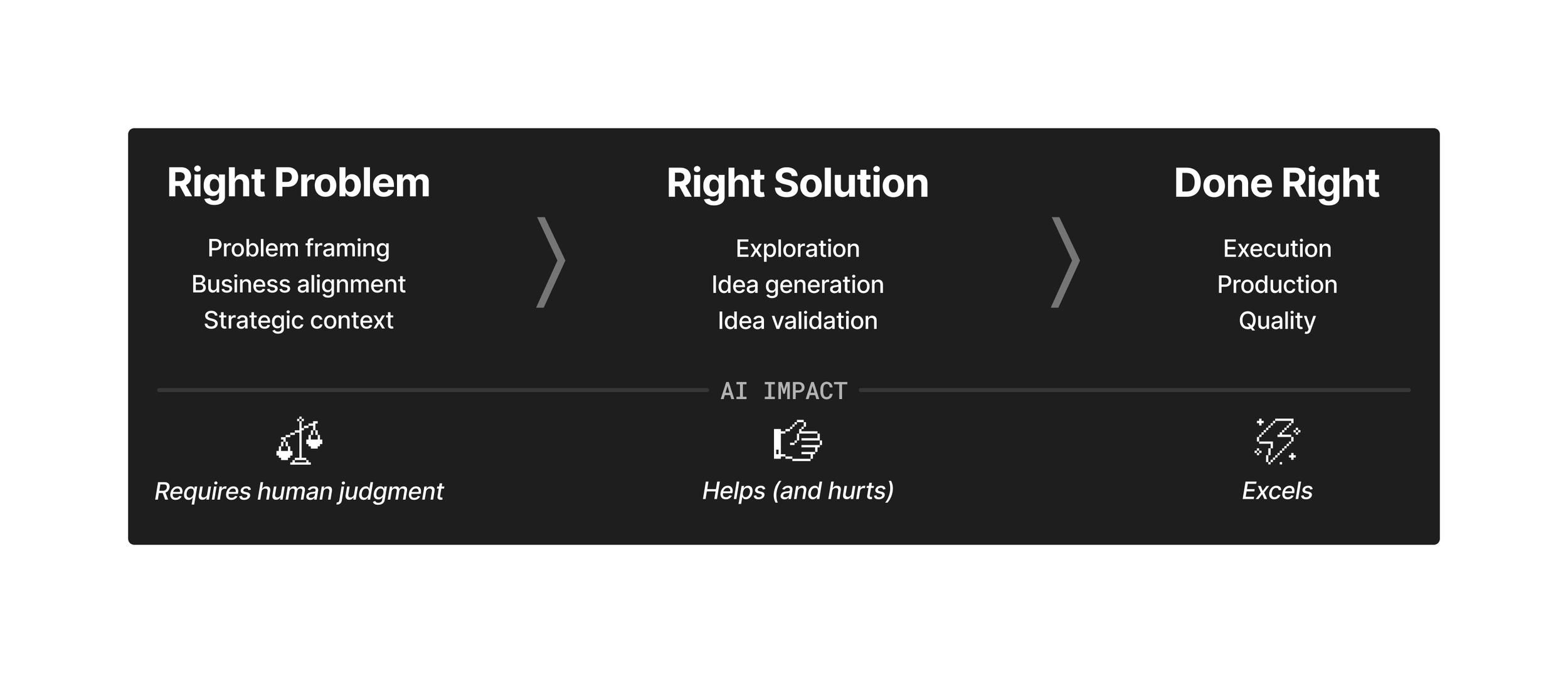 AI's impact differs dramatically at each phase. AI excels during 'done right,' helps with 'right solution,' but still requires human judgment with 'right problem.' Understanding this nuance separates design leaders who optimize for efficiency from those who build strategic capability.