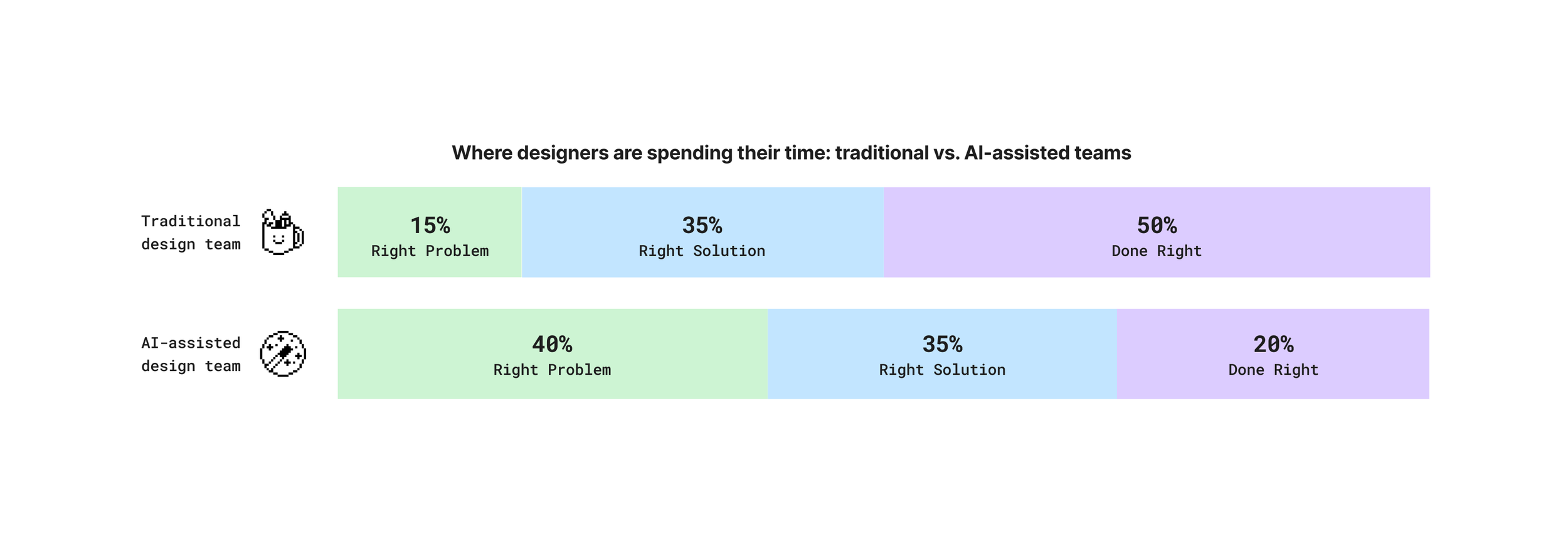 Production work in the Done Right phase used to consume most of a designer's day. AI has reduced the time needed for delivery tasks, raising the stakes for aligning design activity to business impact in the Right Problem phase.